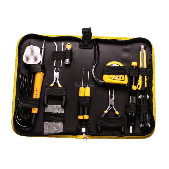 Mini cutter, mini plier, 2 screwdriver (flat blade and cross), 2m measure tape, auto-lock blade, hex allen key set 1,5 to 6mm, desoldering pump, 2m tube of lead-free solder, flat pack metal soldering iron stand, carrying bag285x180x50mm