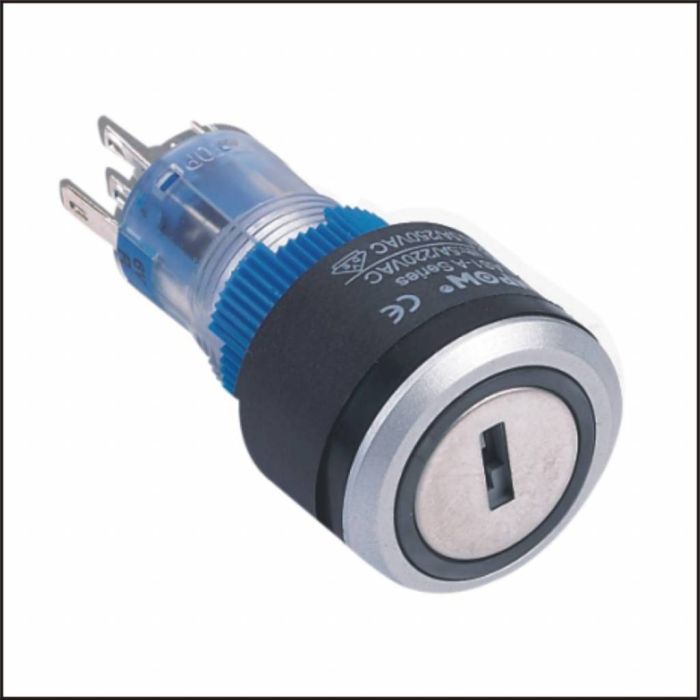 Full metalen sleutelschakelaar, roestvrij staal, 2 standen, 1-polig (3 contacten, 1x contact maak, 1x verbreekcontact) beschermingsklasse IP 50, schakelvermogen 250 V AC - 3 A, montage diameter van 19 mm, soldeerverbinding.