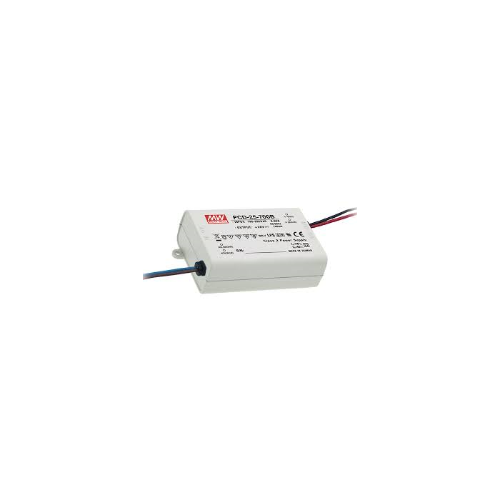 | • PCD-25: AC dimmable, for leading edge and trailing edge dimmers, flexible wire terminals • PLD-25: not AC dimmable, flexible wire terminals • Plastic enclosure IP30 • Overload protection, current limiting, auto recovery • Protections: short circuit/over load/over voltage • Built-in active PFC function • Suitable for LED lighting and moving sign applications • Constant current • EN61000-3-2, Class C, EN55015, EN61347-1, EN61347-2-13 |