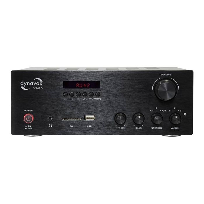 De Dynavox VT-80 is een compacte stereo versterker met twee analoge ingangssignalen (RCA) en digitale ingangssignalen (SD, USB en BT) met de mogelijkheid om 2 paar luidsprekers aan te sluiten, die in paren worden geschakeld of tegelijkertijd